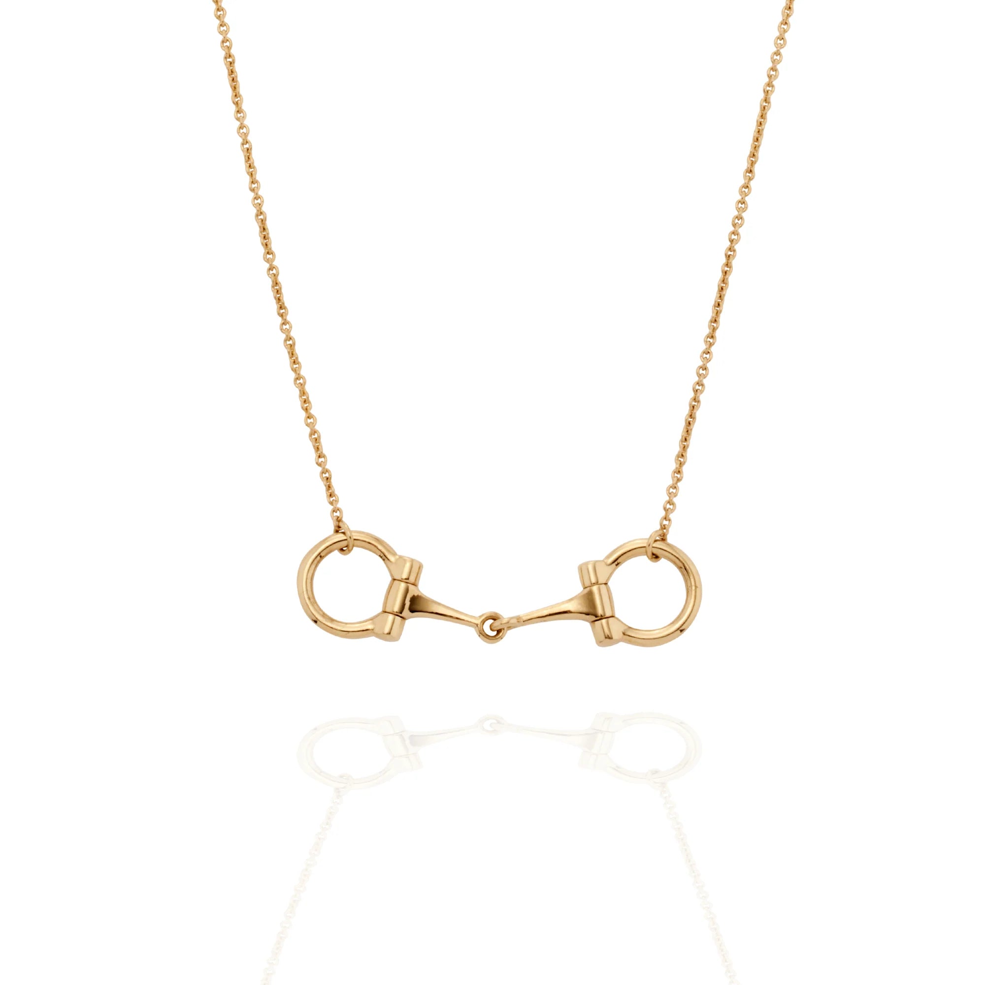 Celebrate your love of all things equestrian with this beautiful horse bit necklace in 9ct solid gold 1.3mm trace link chain featuring a fully articulated solid 18ct gold 12mm horse bit. The trace chain is 45cm in length with a loop at 42cm.
