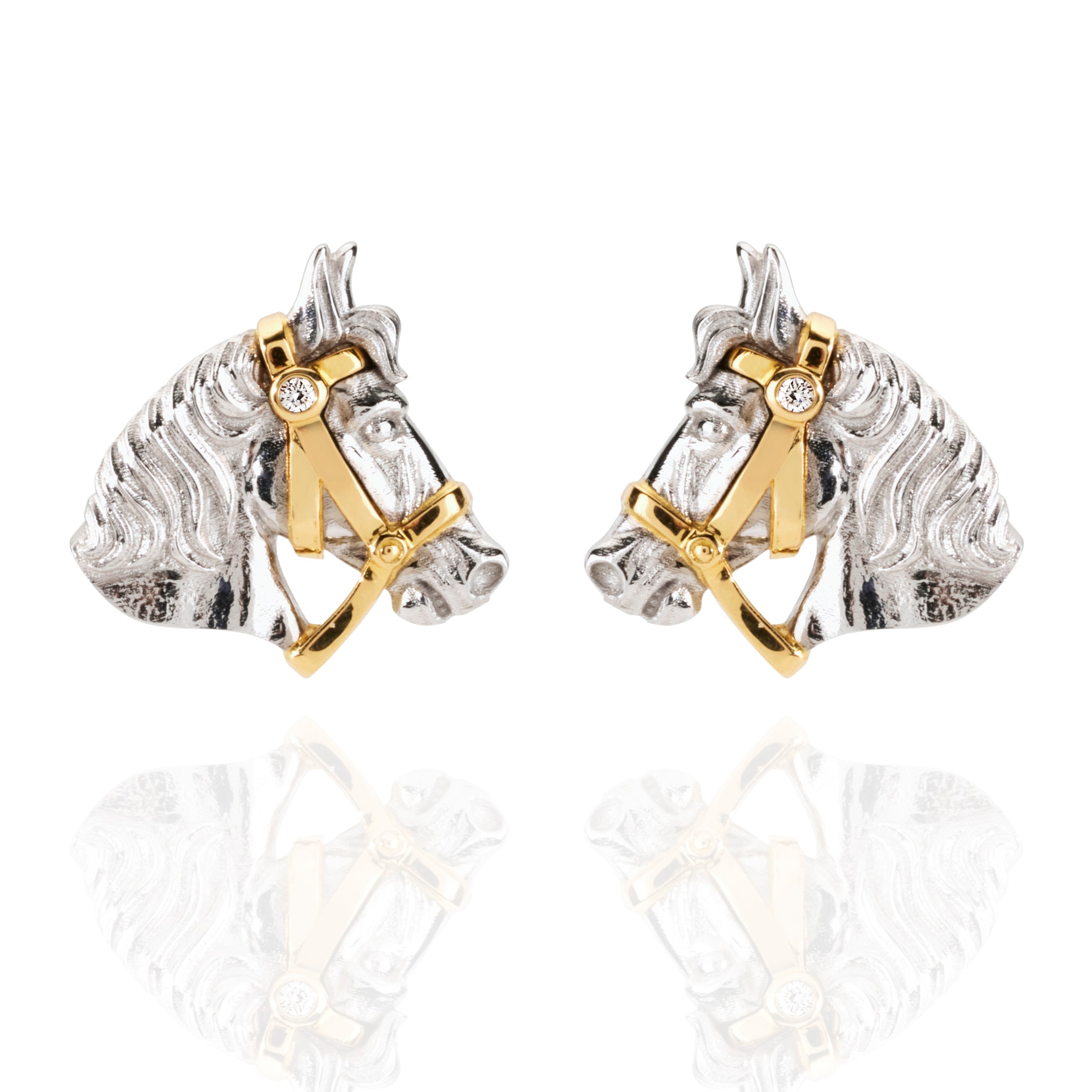 Unique in design and endearing in character, Australian made and designed 18ct white and yellow solid gold stud earrings shine in the form of a beautiful horse, featuring a diamond detail in its golden bridle.