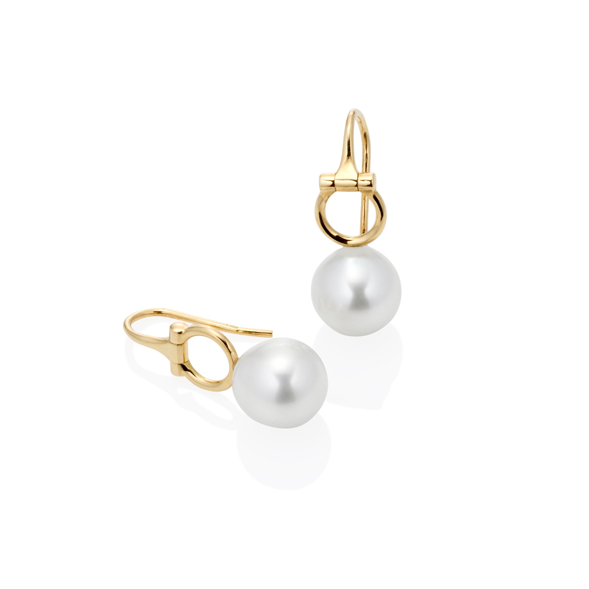 A pair of 18ct solid yellow gold shepherd hook earrings featuring a fully articulated 9mm D-ring set with an 11mm drop shape Australian South Sea Pearl.